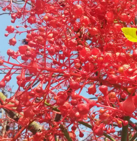 What’s worth noting about clerodendron, which belongs in the mint family – Labiatae or Lamiaceae as it’s now called – is that the flowers have a calyx of coloured sepals. This then produces a flower which is zygomorphic with very prominent stamens. In this case the flower petals and the sepals are almost the same colour so difficult to distinguish. This is not always so, the calyx can be much paler. Clerodendrons can then go on to produce usually dark purple berries which are still surrounded by the pinkish sepals.