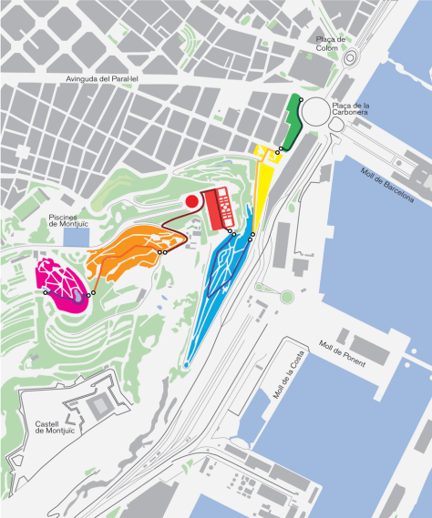 From the Gardens of Joan Brossa you will end up on a main road heading up toward the castle. On your botanical journey you need to head down the hill and towards the east on the map. You will enjoy lovely views of the city and a steep decline towards the Miramar Gardens, the Miramar Hotel and the Poble Sec viewpoint. Here’s the map again to remind you – you are leaving the orange area and heading for the red: