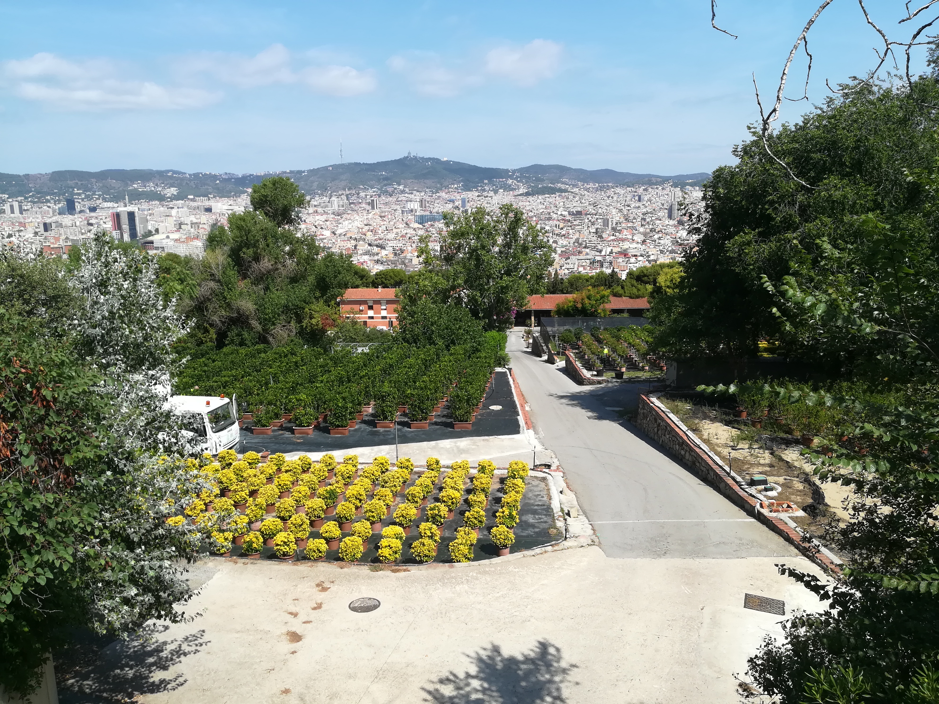 Carry on and turn first right to take you up onto the higher road. Admire the oleanders along the road and the view over the Montjuïc plant nursery.