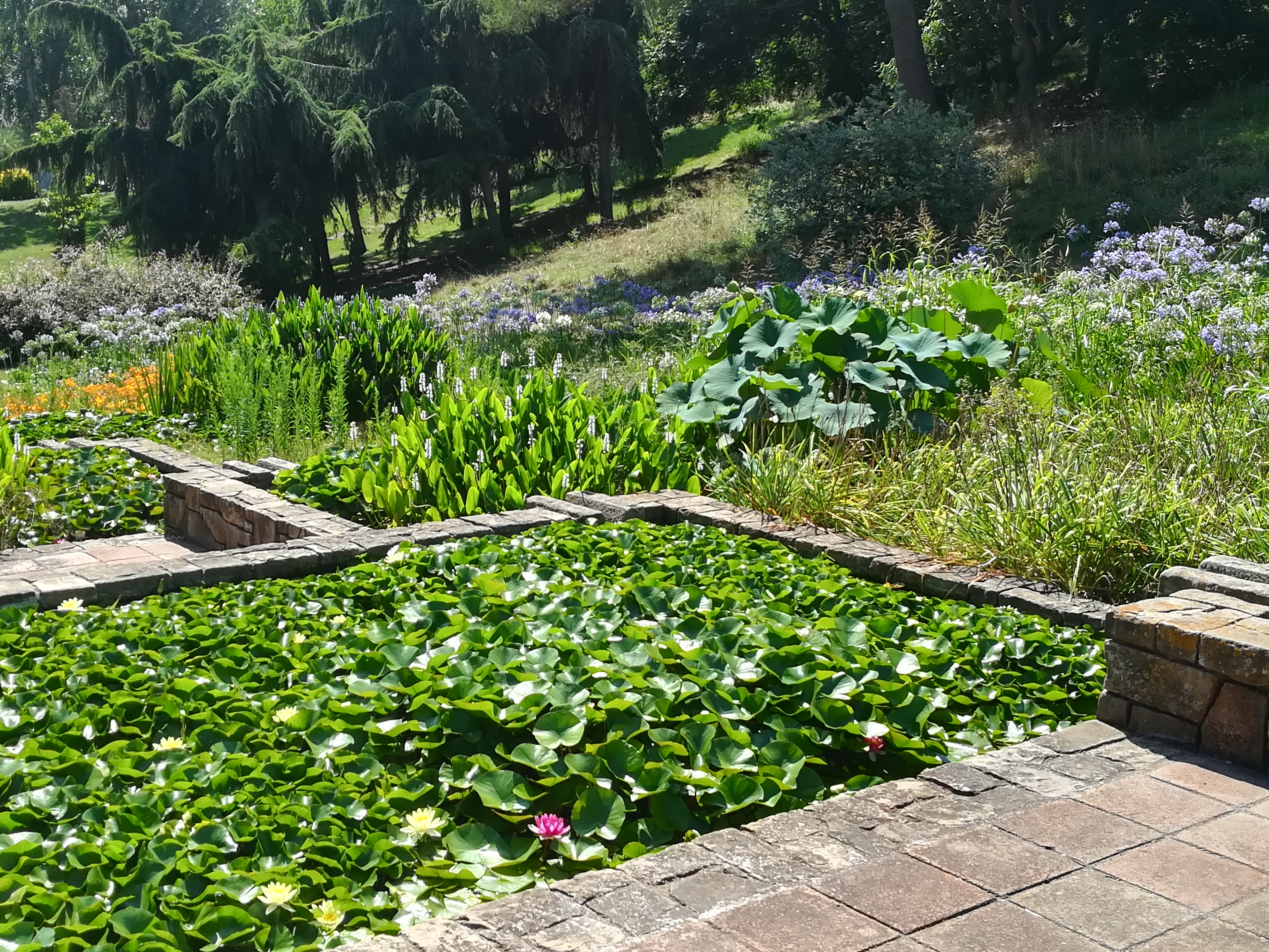 But the greatest delight is to walk downhill and look at the cascade of ponds and their water lilies, lotus flowers and waterside plants.