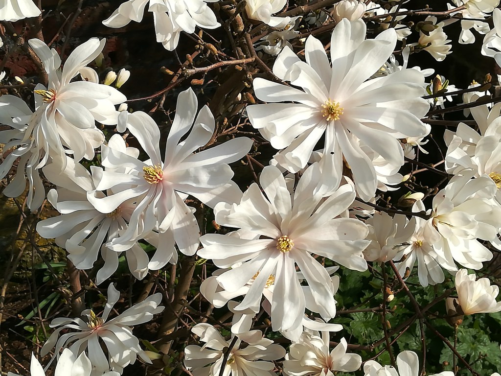 Styrax japonicus or the Japanese snowbell tree is a deciduous tree with white flowers that grows to about 10m high and 4m spread in 20 years, so it is a little on the large side for my garden. However, it is unusual and elegant with the benefit of many white blossoms in May, probably lasting longer than those of a cherry tree.
