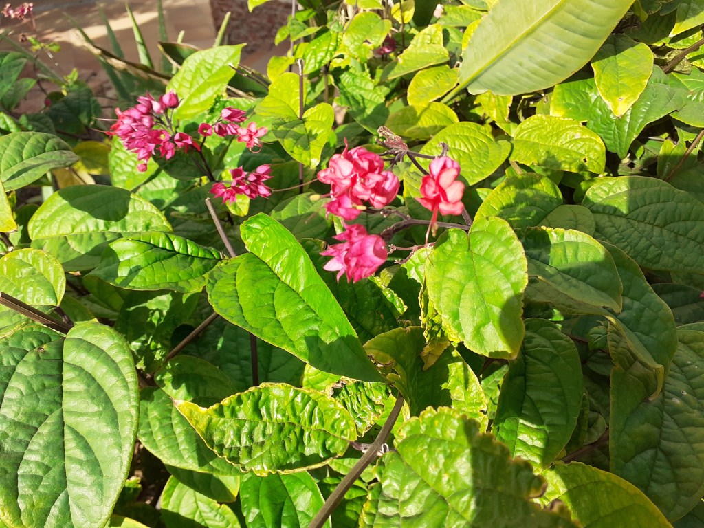 And this pink clerodendron was also in the garden, a shrub about a metre high. I didn’t recognise it as a clerodendron, which is familiar to me as a tree planted on Hackney streets (probably C.bungei). It flowers in the late summer and has thick evergreen leaves.
