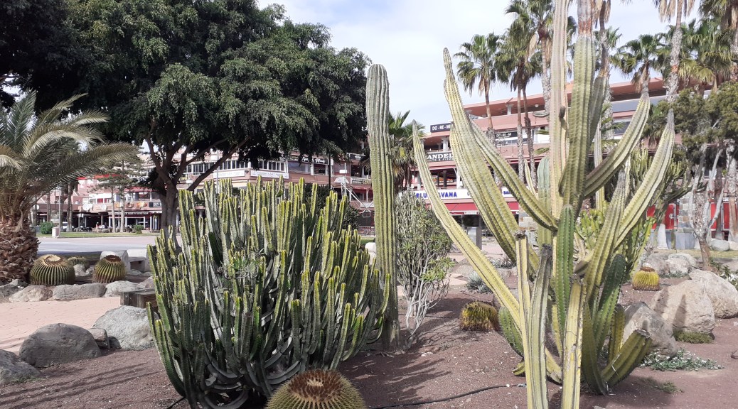 If there is a centre to Maspalomas it is the Yumbo Centre which is a sort of 1970s concrete shopping mall with a garden at its centre. Here there’s some grass, a few sculptures and rocks plus a planting of palms, succulents, cacti and exotic trees.