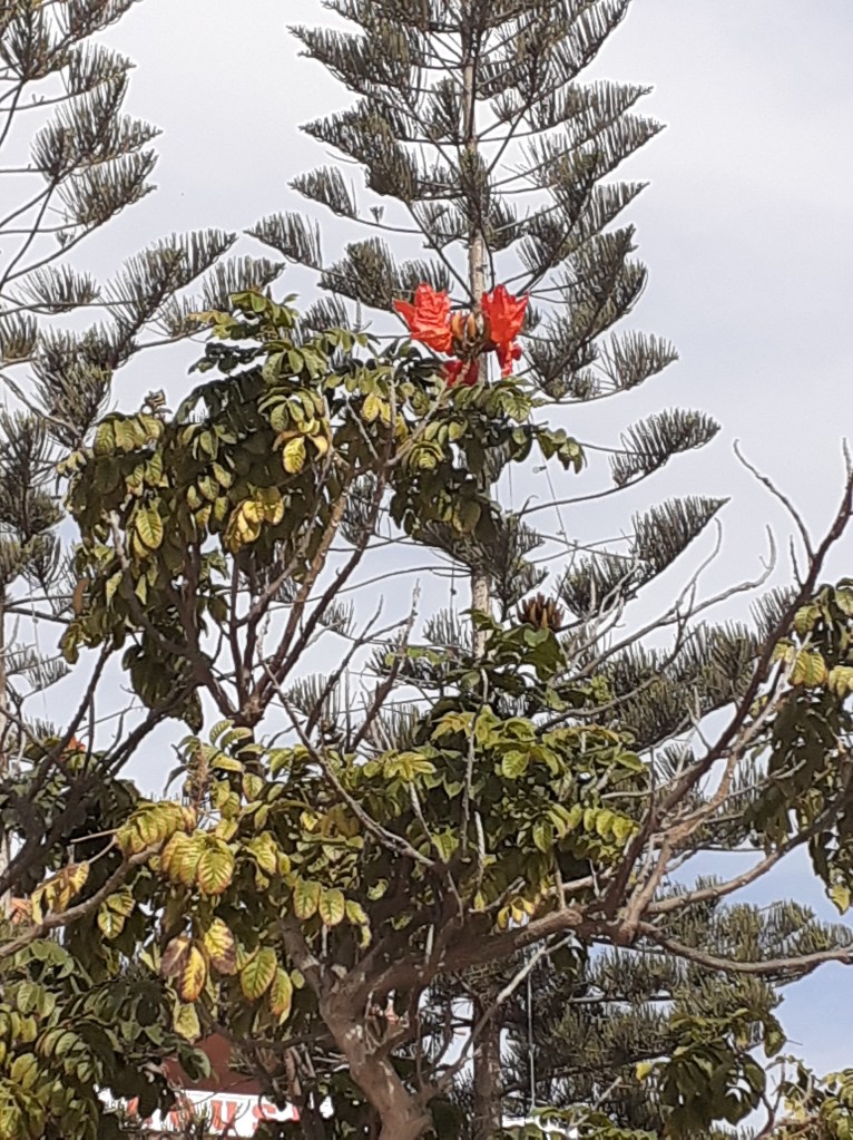 There’s also Norfolk Island pines, Araucaria heterophylla, commonly planted on the island, and I think the African tulip tree, Spathodea campanulata. It’s flowering but looking a bit dried up – probably a result of incessant wind at this time of year.