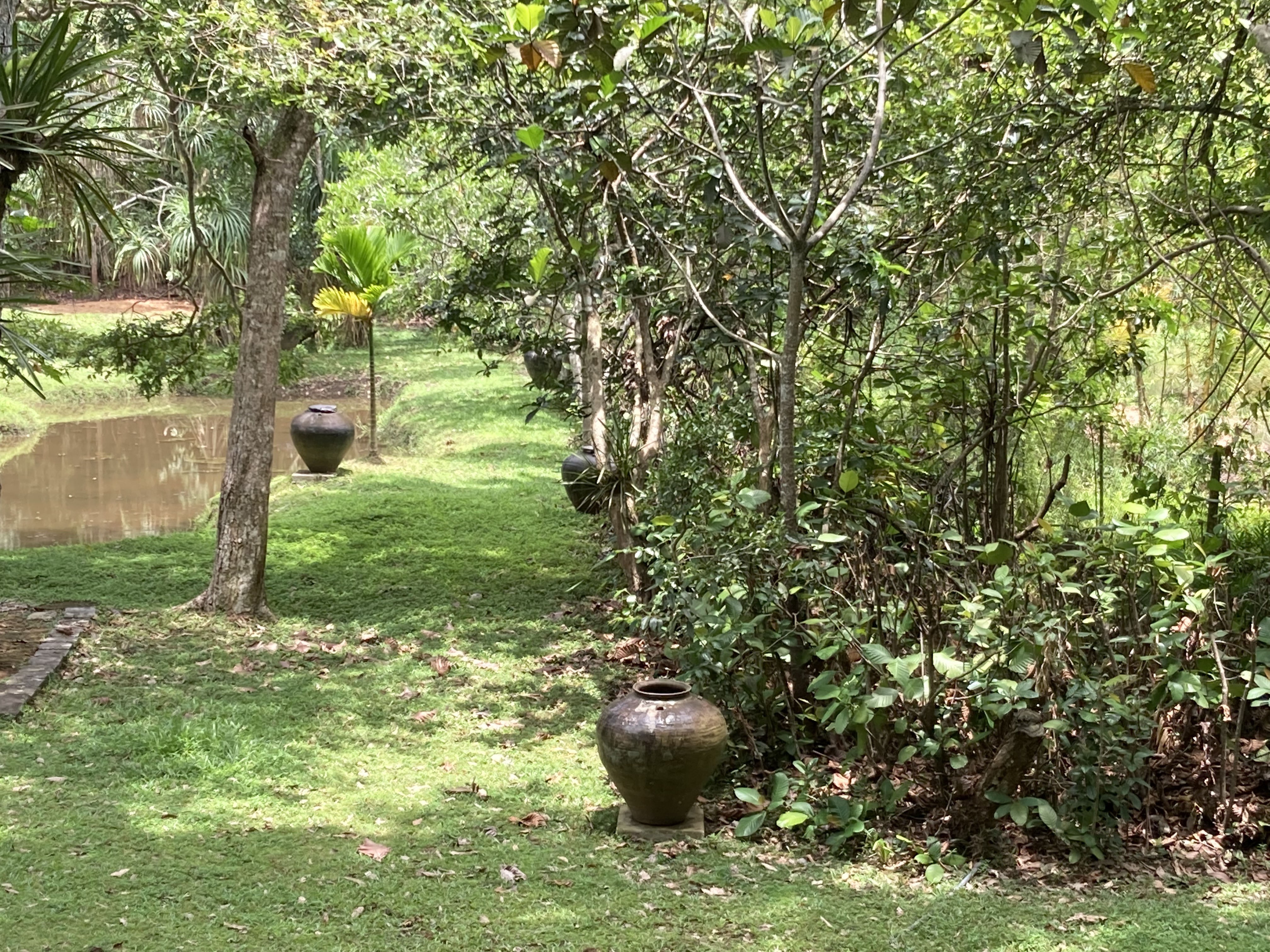 It is said that Bawa also carefully considered the view from this table, to the south towards Cinnamon Hill. In Capability Brown fashion, he had the hill lowered and a country lane sunk down so as not to interfere with the vista across the water to a resplendent white Buddhist temple. Unfortunately, the temple is now hidden by trees.