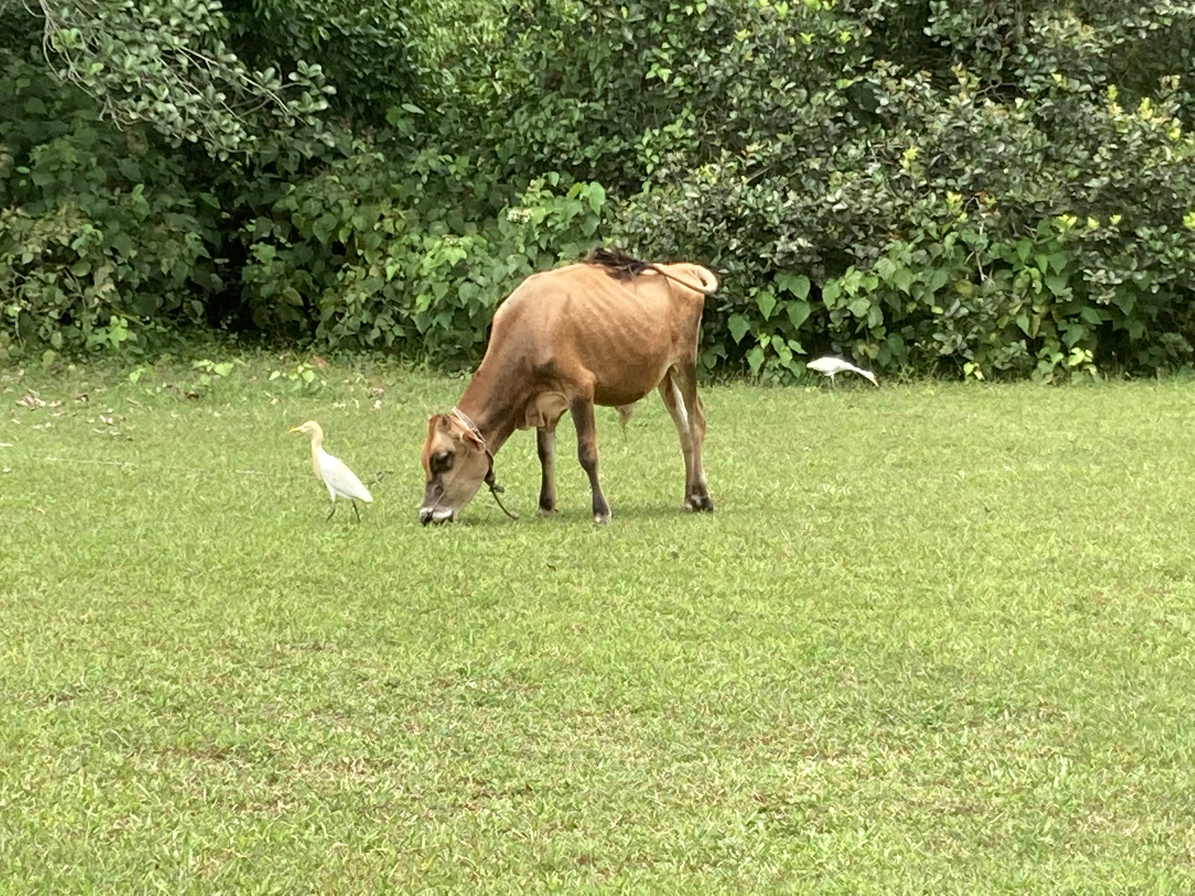 Walking over the hill, named after an old cinnamon plantation, the lagoon becomes visible on the southern side. Here cows help keep the grass short, accompanied as is traditional in Sri Lanka, with an egret or two. And to the right side, one of several brick towers supports a windmill used for raising water (10).